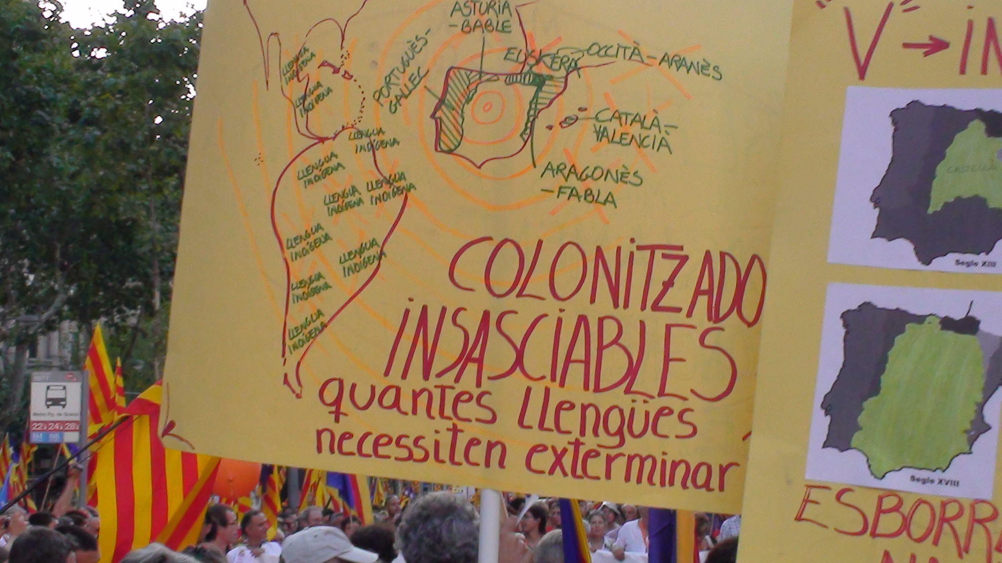 Com deia una pancarta en aquesta manifestació històrica, al costat d’un mapa amb les llengües esborrades a la península i a Amèrica Lllatina: “Colonitzadors insaciables, quantes llengües necessiteu exterminar?”